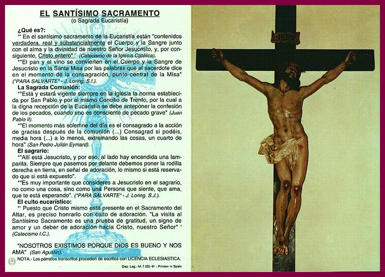 "En el santísimo Sacramento de la Eucaristía están contenidos VERDADERA, REAL Y SUBSTANCIALMENTE el Cuerpo y la Sangre junto con el Alma y la Divinidad de nuestro Señor Jesucristo y, por consiguiente, Cristo entero" (CIC).
